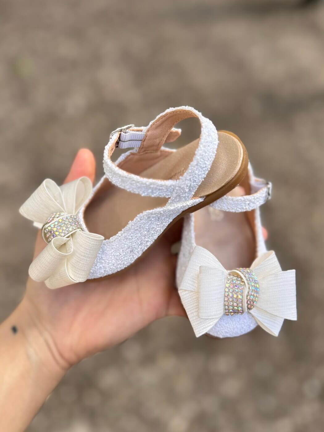 Φανταστικά χειροποίητα δερμάτινα παπουτσάκια σε λευκό απαλό γκλίτερ και διακοσμητικό μπεζ-ιβουάρ φιόγκο με στρας.